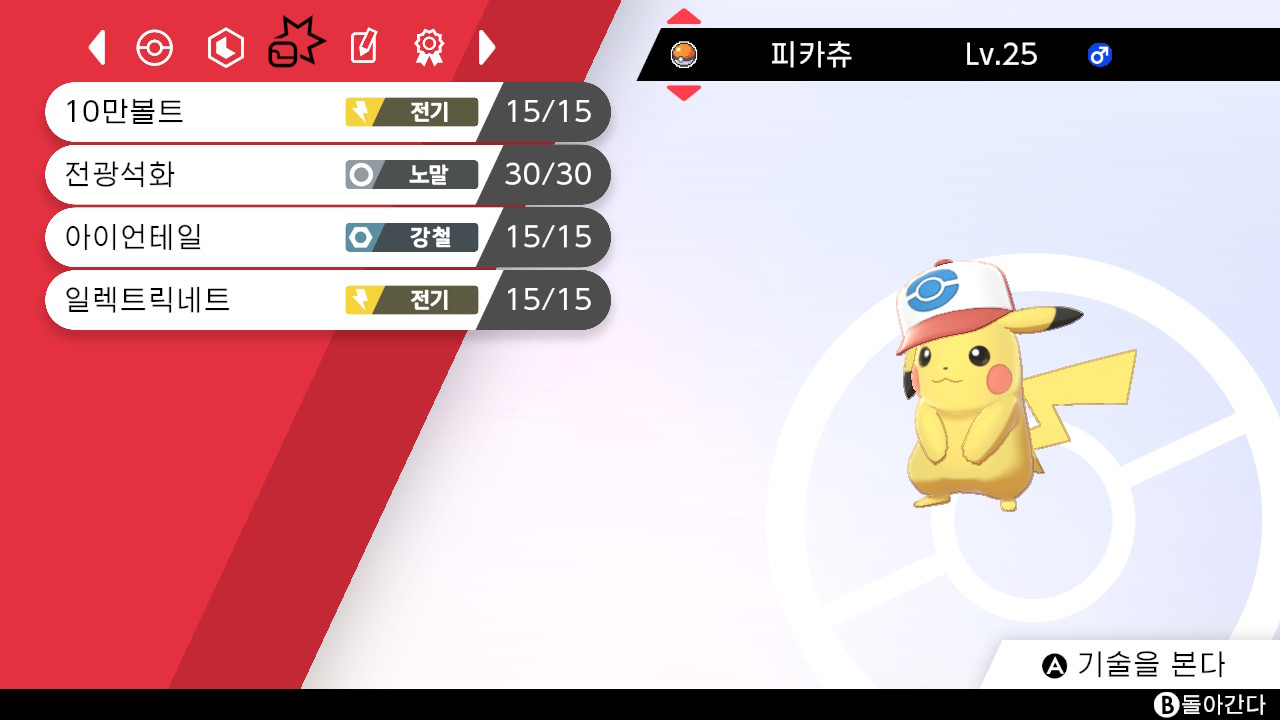 기술배치는 10만볼트 / 전광석화 / 아이언테일 / 일렉트릭네트입니다.